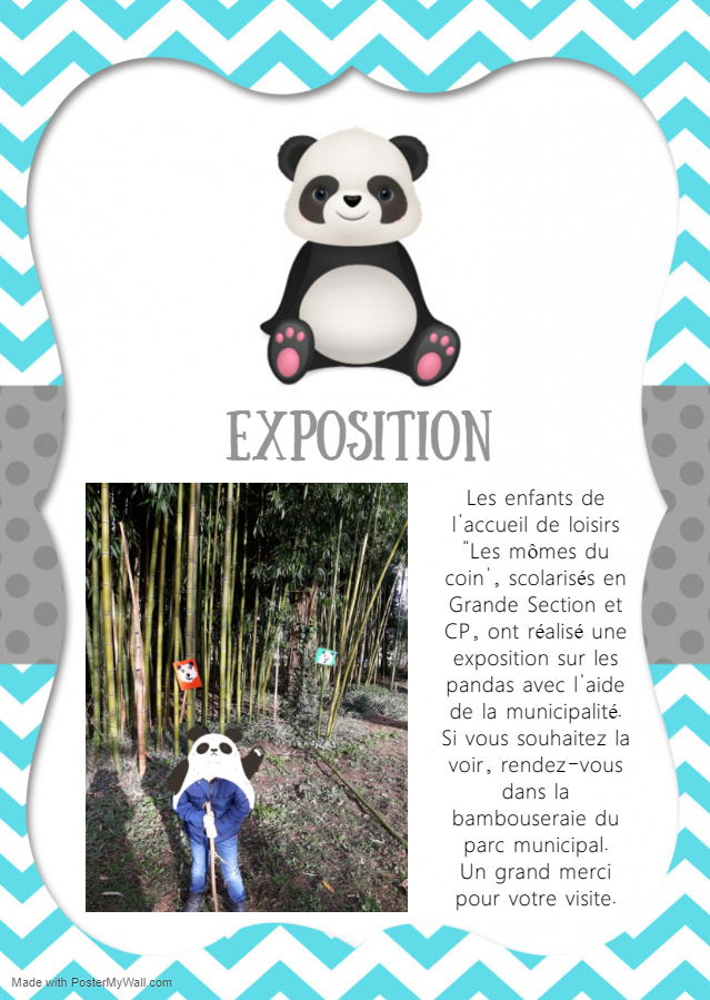 Exposition « Pandas » à Montbron proposée par les enfants des Mômes du Coin Vous souhaitez plus d'informations sur cette exposition ? Rapprochez vous du directeur de l'Accueil de Loisirs (07.60.61.21.63.).