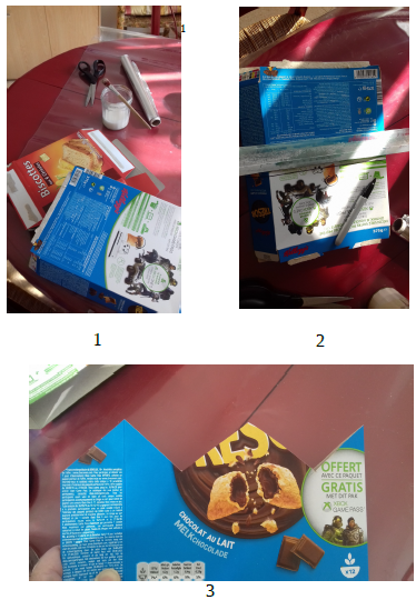 1. Il me faut : une boîte de céréales vide, du papier aluminium, de la colle, un pinceau, un feutre noir et une règle.