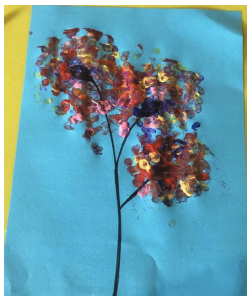 3) Une fois votre modèle de tige faite, donner la feuille à l'enfant, et expliquez lui qu'il doit faire des points de peinture avec le coton tige ( ou sans ) au niveau du bout de la tige.