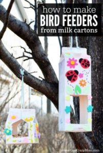 Mangeoire à oiseaux en brique de lait Demander à un adulte de découper une ouverture sur deux côtés de la brique de lait ou de jus de fruits. La peindre tout en blanc Lorsque c’est sec, la décorer avec des feutres, des paillettes, marqueurs, commettes...