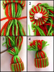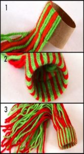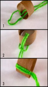 Vous avez besoin : un rouleau de papier wc vide, des ciseaux, de la laine(environ une pelote) et un petit peu de coton