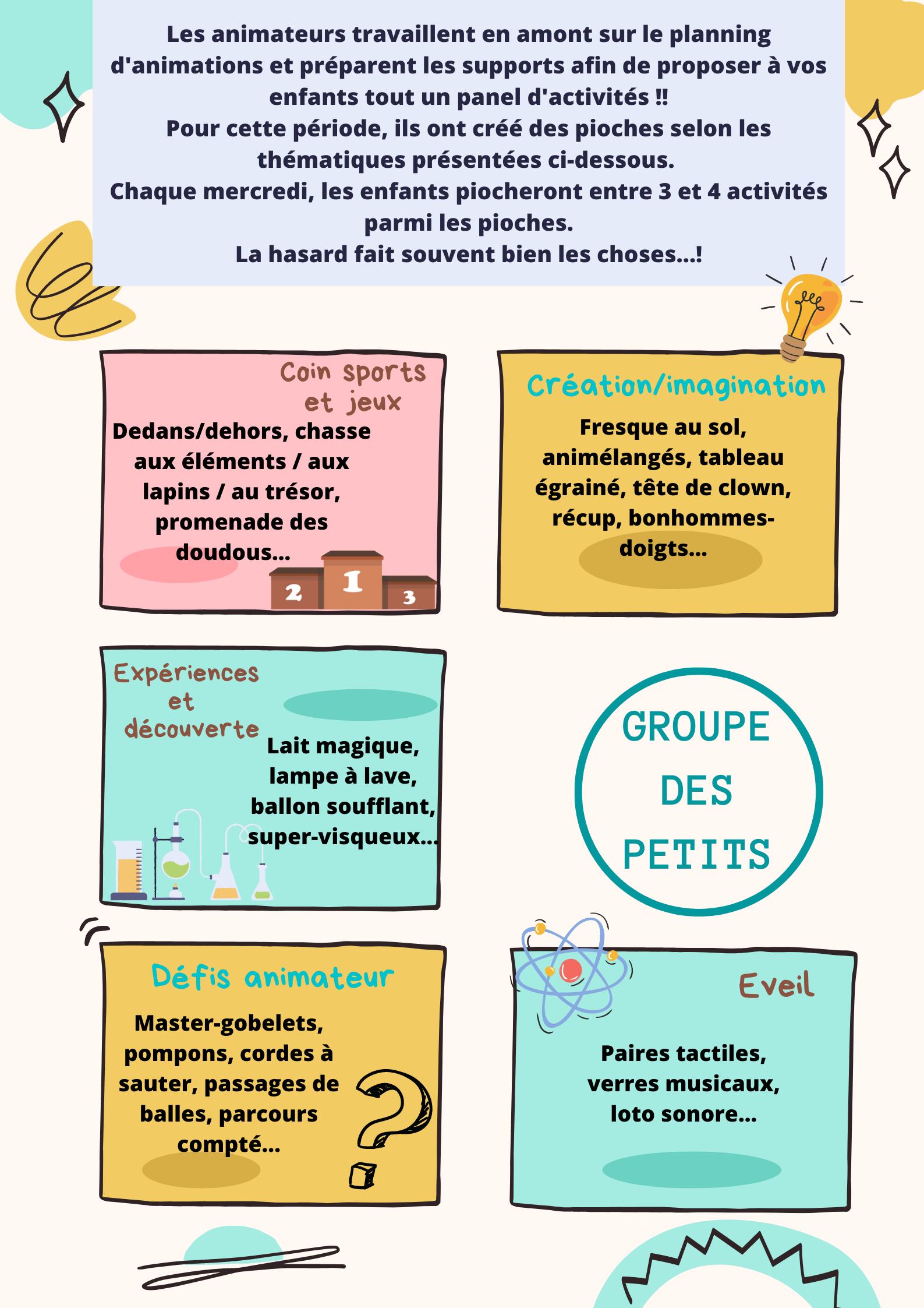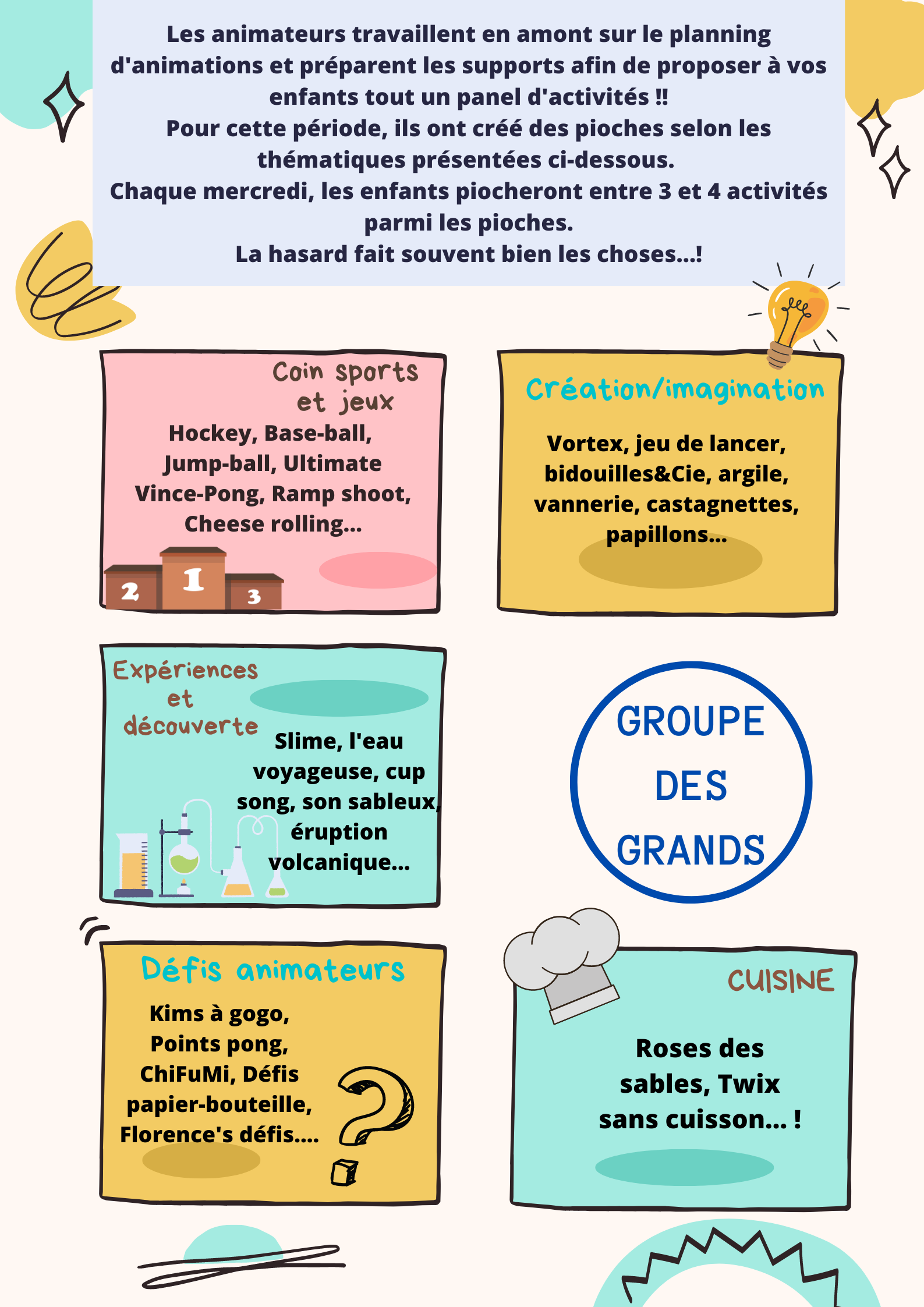 Créations artistiques et manuelles, ateliers de découverte, activités culturelles, défis, expériences scientifiques ou jeux sportifs...