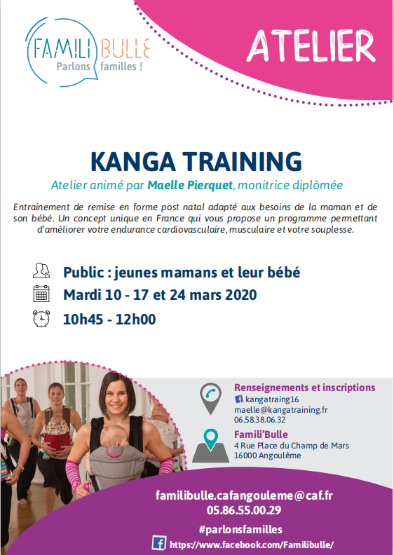 Kanga Training à Famili’Bulle + Ajouter à mon Agenda Google + iCal / Outlook export Date 10 Mar 2020 Expired! Heure 10 h 45 min - 12 h 00 min Lieu Famili'Bulle Centre Commercial, 4 Place du Champ de Mars, 16000 Angoulême Catégorie Actus partenaires Organisateur Famili'Bulle - Caisse d'Allocations Familiales Téléphone 05 86 55 00 29 Email familibulle.cafangouleme@caf.fr Site Web http://@familibulle Partagez cet événement