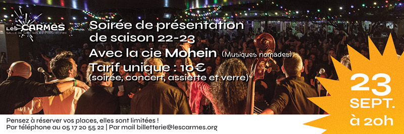 Merci à chacun(e) de nous confirmer votre venue avant le mardi 20 septembre (le nombre des places étant limité vue la configuration spéciale de la salle pour cette soirée) : billetterie@lescarmes.org