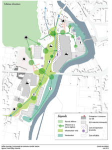 Outre les contraintes et la volonté de garder in situ les trois entreprises déjà présentes (Borflex, SILAC Industrie et Fun Bike), il s’agit d’affirmer une infrastructure verte reliant Saint-Florent à Taracole. Cette coulée verte, véritable colonne vertébrale du projet devient le support de greffe de nouvelles fonctions : activités, habitat, espaces publics, mise en valeur du patrimoine architectural… Une ossature Nord/Sud va permettre la requalification de l’entrée de ville, aujourd’hui marquée par la présence de l’automobile, en renouant avec le lien direct que celle-ci entretenait avec le prieuré et plus loin la place Saint-Florent. La renaturation des berges permet d’amplifier cette présence de nature, à la fois récréative, protectrice, et productrice d’image nouvelle, tout en valorisant les différents milieux écologiques en présence.